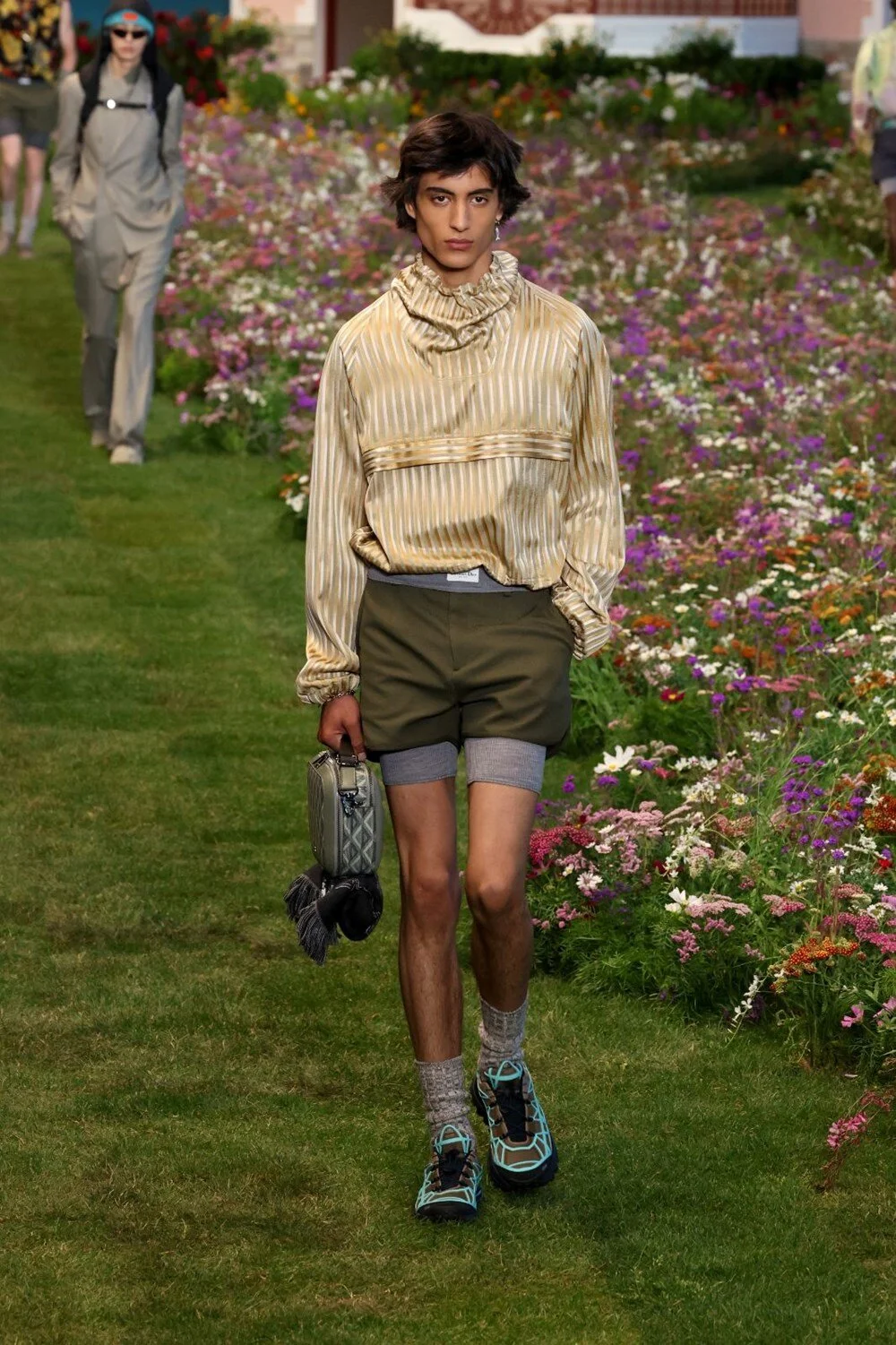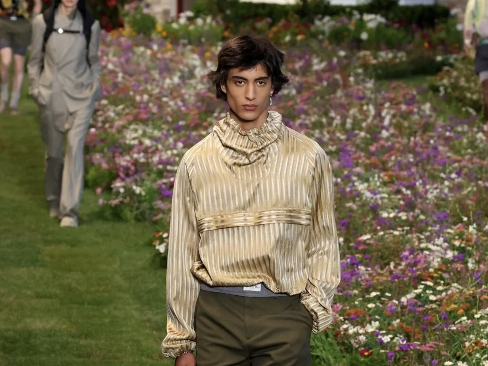 Markanın kreatif direktörü olan Kim Jones, sarı renkli yaldızlı kumaşı Dior’un 2023 yaz erkek koleksiyonuna dahil etti.